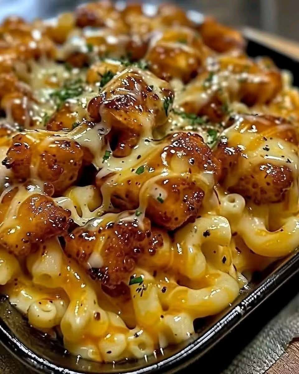 Transfer the mac and cheese to a serving dish and top with honey pepper chicken.
