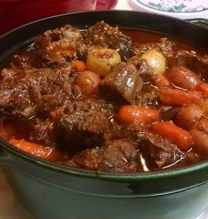 Add the diced potatoes, carrots, celery, & bay leaves to the slowcooker. Now, pour the broth/Worcestershire mixture in the crockpot as well. Cover; cook on low for 8 hours. Remove the bay leaves before serving.